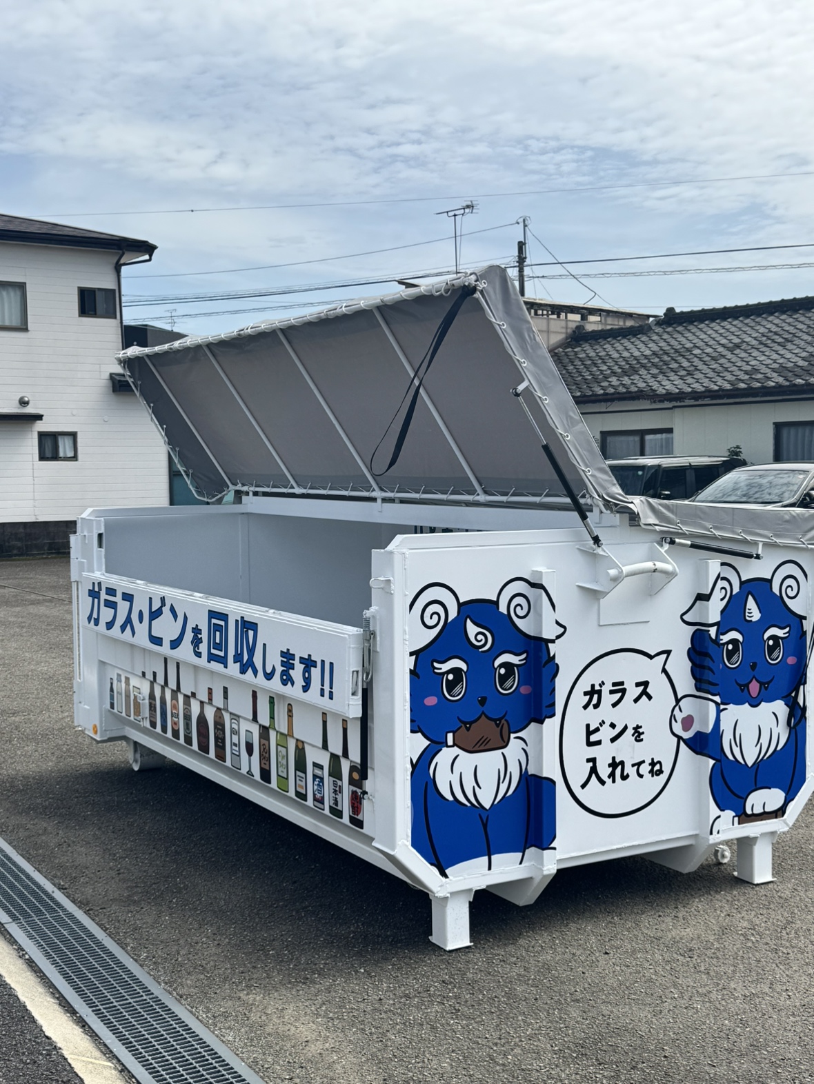回収ボックスは、白いコンテナ型で、青いキャラクターのイラストと「ガラス・ビンを回収します」の表示が目印です。